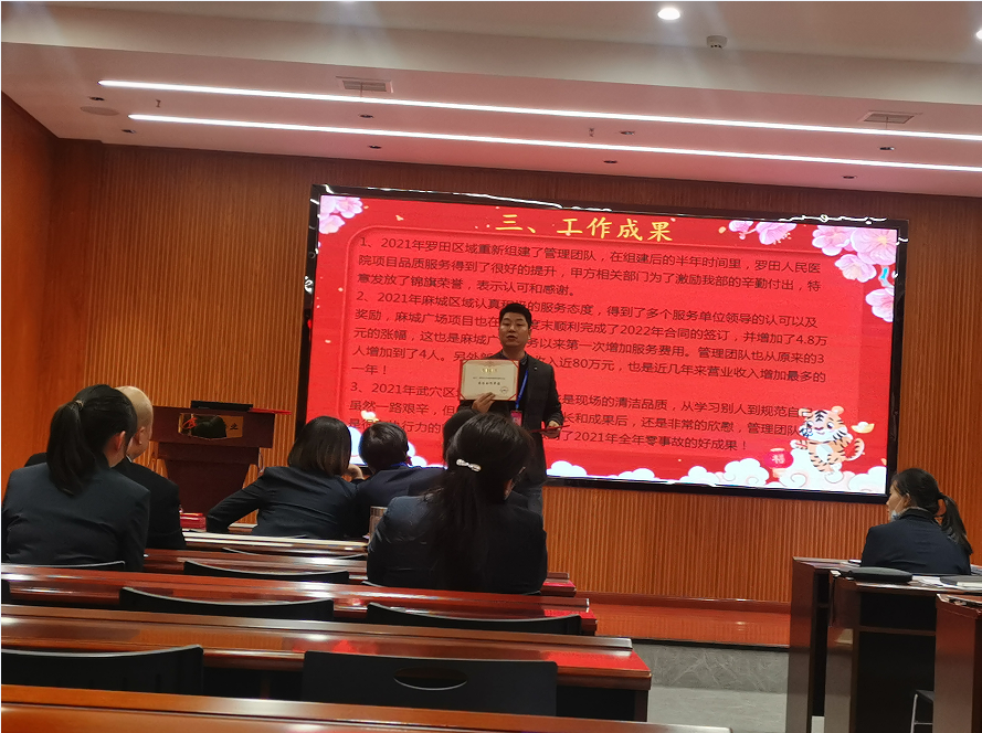 自1月24日起到27日止,分公司总结表彰大会先后在总部和浠水区域举行,集团公司董事长郭海燕、总经理瞿全胜分别参加了各分公司会议,并向大会致新年贺词;分公司各区域经理、项目经理和主管及行政后勤人员参加了各自分公司的会议。按照规定流程,大会在领导致词后,对集团公司统一评选出来的“优秀员工”、“优秀主管”、“优秀经理”进行了表彰,颁发了奖金和荣誉证书;接着,分公司运营总监对2021年度工作进行了回顾,特别对工作中的不足和问题及产生的原因进行了分析,重点对2022年度工作任务进行了安排部署,提出了希望;签订了经营目标及安全责任状、竞业限制承诺书;优秀人员代表发言;区域经理带领项目经理和主管集体宣誓表决心;兑现了2021年度绩效奖金。根据领导要求,会议安排了总部行政人员分头参加会议,听取业务人员对总部工作的意见建议;会议中间还穿插了有趣的抽奖活动。